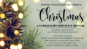 Tickets for this year’s Candlelight Service and Dinner at The Kitchen at Grace Meadows are $30 per person. All children who regularly attend STBC are covered by the church.